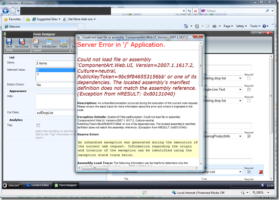 “Could not load file or assembly ‘ComponentArt.Web.UI, Version=2007.1.1617.2,Culture=neutral,PublicKeyToken=9bc9f846553156bb’ or one of its dependencies. HRESULT: 0x80131040”